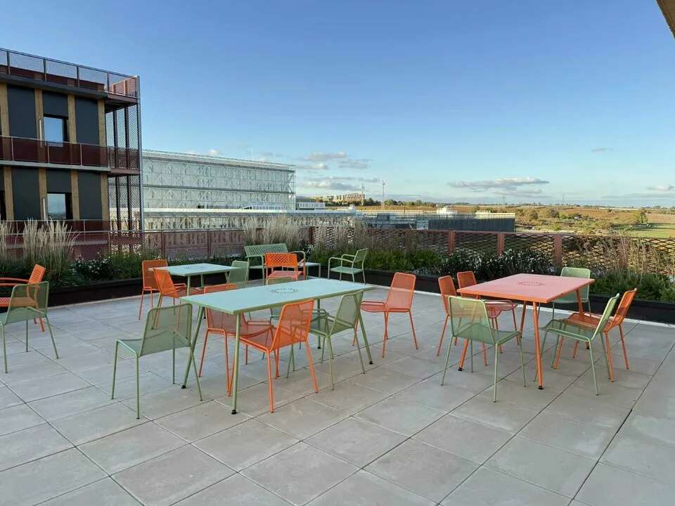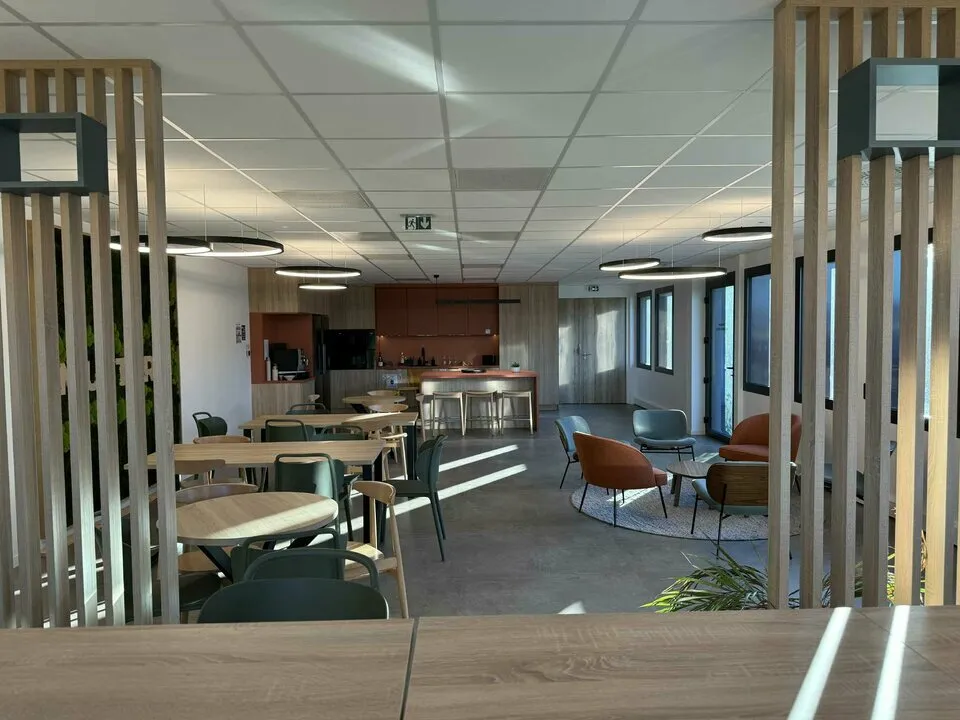 Les espaces communs constituent un véritable atout : un espace de détente et de restauration avec cuisine entièrement équipée favorise la convivialité entre collaborateurs, complété par une magnifique terrasse aménagée pour profiter de l'extérieur. Le bâtiment bénéficie d'une architecture contemporaine avec de larges baies vitrées qui inondent les espaces de lumière naturelle.