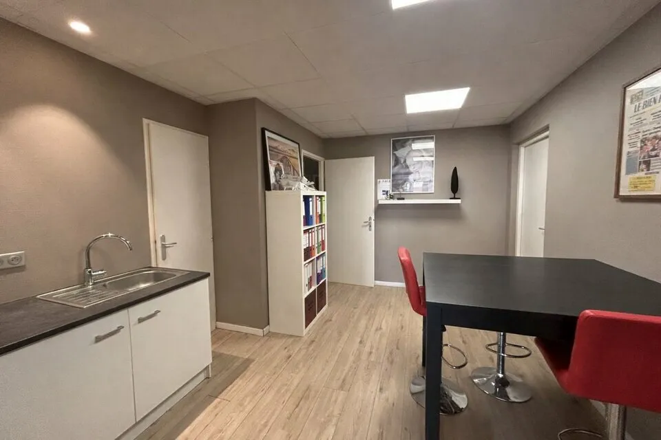 Le bien se compose de 54 m² de bureaux et locaux sociaux au rez-de-chaussée et de 45 m² de bureaux à l'étage ainsi que d'une grande salle de réunion avec cuisine aménagée de 104 m²..